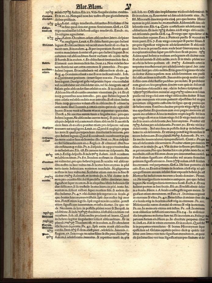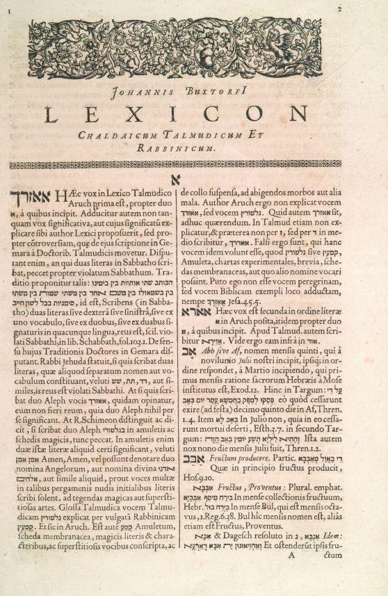 Section titled “Early Modern Christian Rabbinic Lexicography”The study of Hebrew gained rapid and fervent popularity among Christian scholars from the 16th to the 18th century. The Christian Hebraists undertook studies of the classical Jewish literature, biblical and rabbinic, in their attempt at arriving at the Hebraica Veritas: the truth of Christianity as seen through the original literature of the Jews. The scholarship could aim to understand, demystify, defend, or even vilify Judaism, as well as to elucidate or distort rabbinic literature